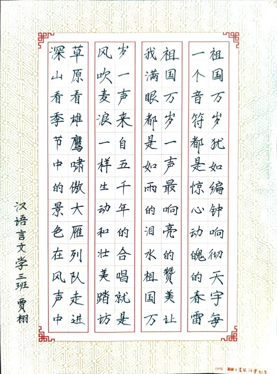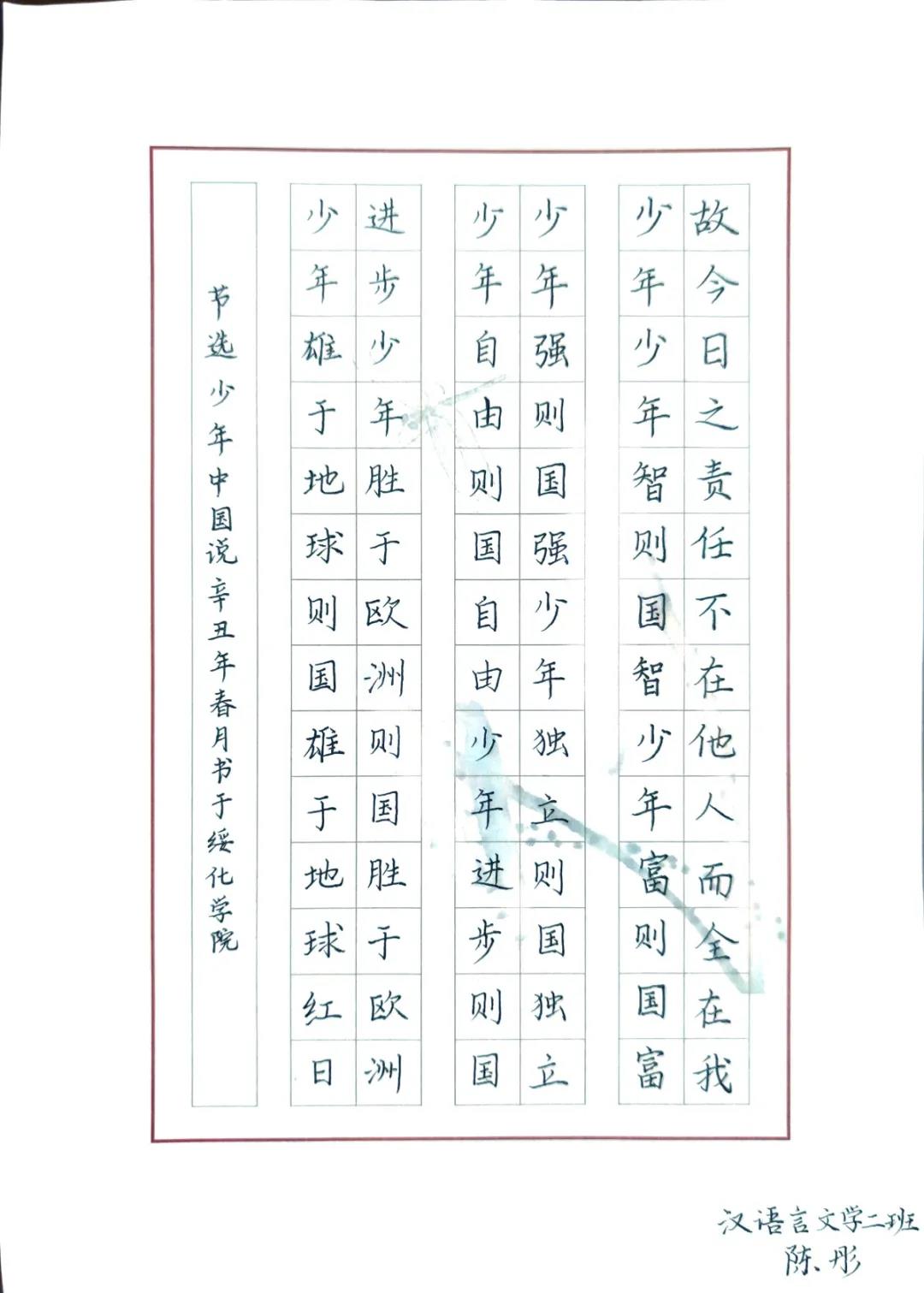 本次比赛规定以红色革命题材诗词和警示励志名言为书写内容,立足PP电子专业学科特色,讴歌革命先烈英雄主义情怀,在革命诗句中感受红色政权来之不易、新中国来之不易、中国特色社会主义来之不易,不断厚植爱党、爱国、爱社会主义的情感,不断传承红色基因,肩负使命重担,献礼建党百年。