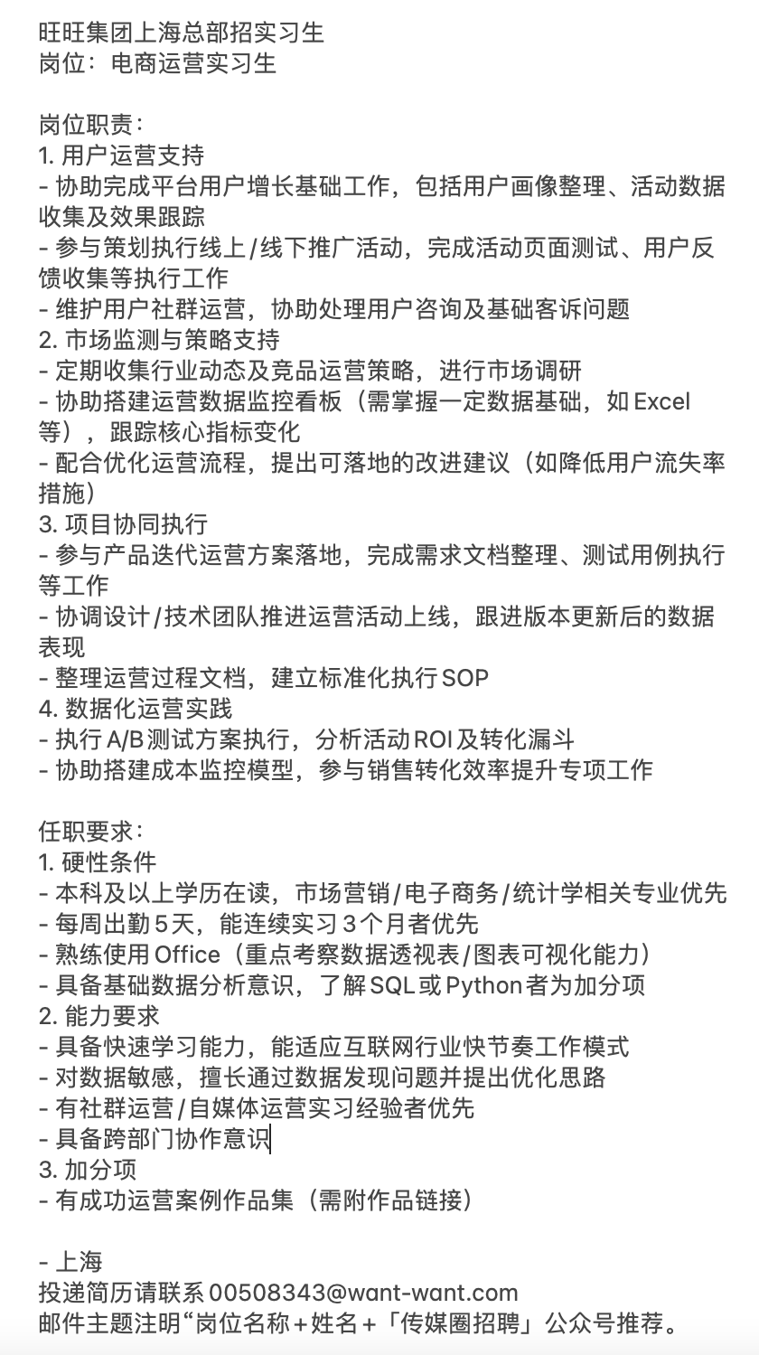 就业指导丨旺旺集团上海总部招聘实习生!