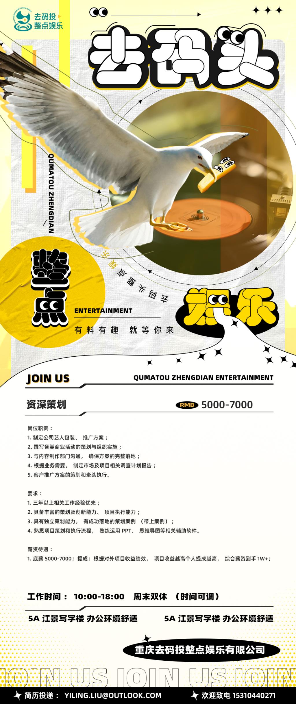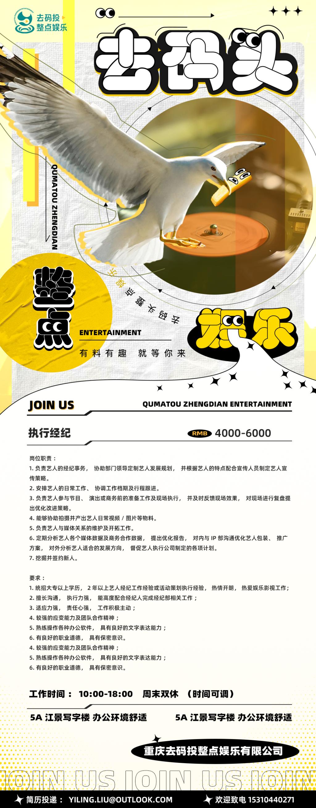 重庆去码投整点娱乐招聘:资深策划、自媒体运营、摄影摄像、执行经纪、艺人助理