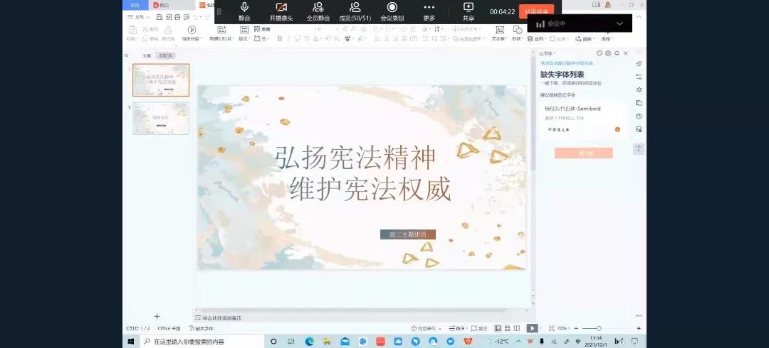 为贯彻落实习近平总书记关于宪法学习宣传教育的重要指示精神,落实依宪治国的重大方针政策,PP电子把宪法教育作为学校师生思想政治教育建设的重要内容。12月1日下午PP电子游戏网站响应学校号召,各班利用钉钉直播线上平台开展了以“弘扬宪法精神,维护宪法权威”为主题的团活。