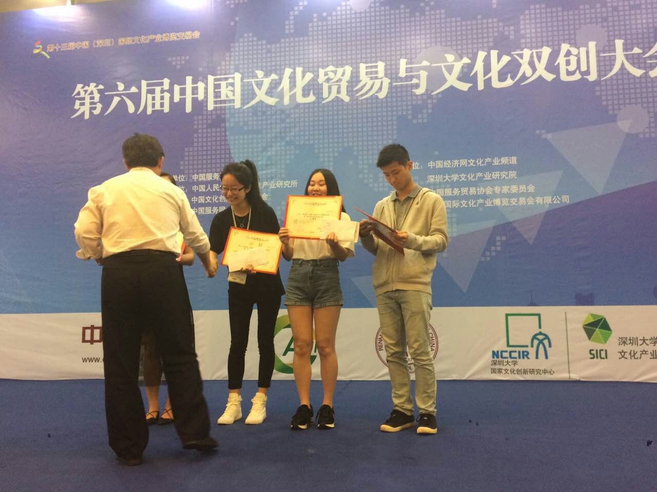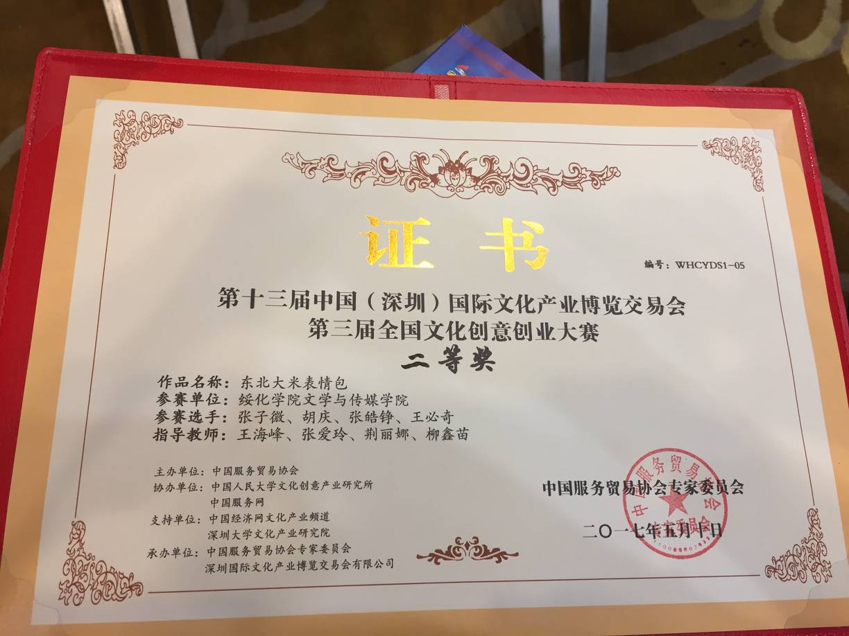 此次大赛由中国服务贸易协会主办,中国人民大学文化创意产业研究所、中国服务网协办,中国服务贸易协会专家委员会、深圳国际文化产业博览交易会有限公司承办。在参加决赛现场和颁奖典礼上,张子微都身着团队制作的东北大米表情包文化T恤衫。黑色的T恤,胸前印着表意“稀罕”的卡通表情,生动地传达了东北人的热情与东北文化的魅力。
