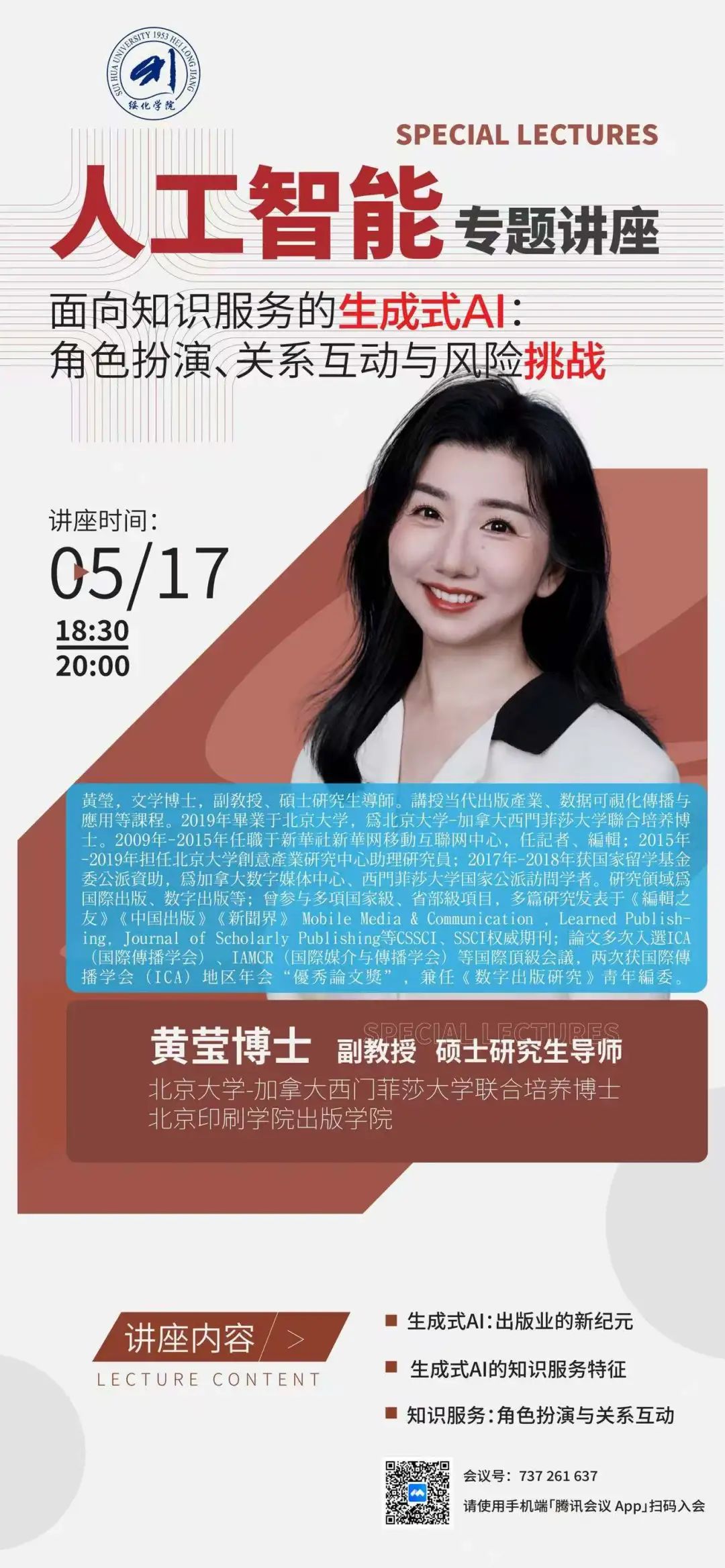 5月17日晚六点半至八点,PP电子游戏网站师生隔空聆听了来自北京印刷学院出版学院的副教授、硕士研究生导师黄莹博士的学术讲座,这也是PP电子游戏网站寒地黑土大讲堂的第480期讲座,由数字出版专业负责人吴春生老师主持。讲座的题目是:面向知识服务的生成式AI:角色扮演、关系互动与风险挑战。