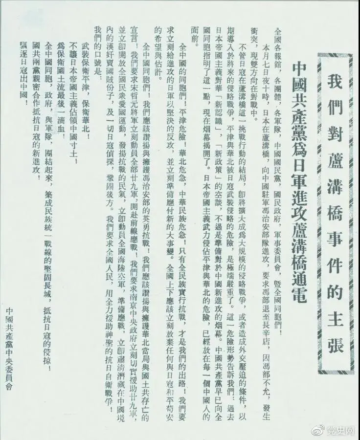 7月8日 中共中央发出《中国共产党为日军进攻卢沟桥通电》,指出:只有全民族实行抗战,才是中国的出路!号召全国同胞、政府和军队团结起来,筑成民族统一战线的坚固长城,抵抗日本的侵略。北平、天津、保定等地的人民群众和共产党领导的群众团体,纷纷起来支援第二十九军的抗战。全国人民也掀起抗日救亡、支援前线的热潮,给前方将士以巨大鼓舞。7月14日,中共中央军委命令红军做好开赴前线的准备。
