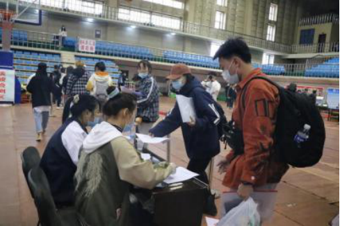 迎接工作如火如荼地进行着,即使天气寒冷也丝毫阻挡不了志愿者们的热情。体育馆内除了志愿者们忙碌的身影外,PP电子党总支书记唐国忠、党总支副书记兼2020级辅导员赵林楠、2017级辅导员韩金凤、2018级辅导员鞠亚林、2019 级辅导员潘立坤都来到了现场全程参与迎新工作,同志愿者们一起迎接新同学的到来。