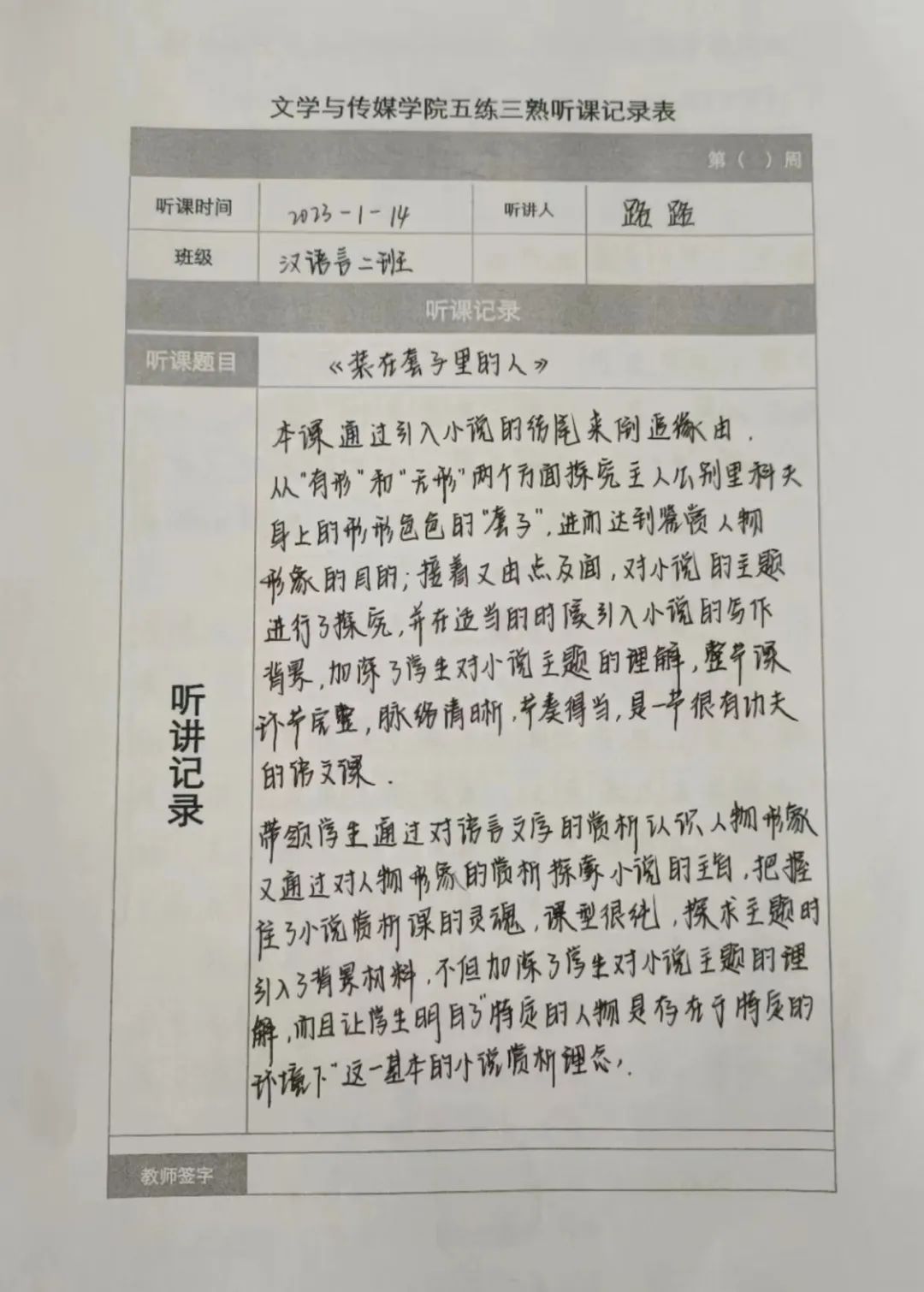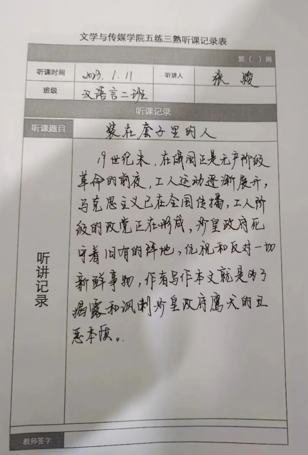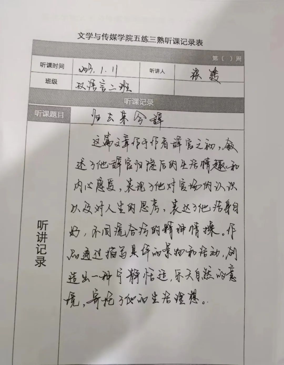 听课记录是听课的第一手资料,是课后进行教学反思交流的材料和依据,更是促进教师专业成长和提高教学水平的极其宝贵财富,为使汉语言专业学生更好的学习专业技能,PP电子游戏网站特开展听课笔记优秀作品展示活动,让我们一起来看看同学们的听课记录表吧!