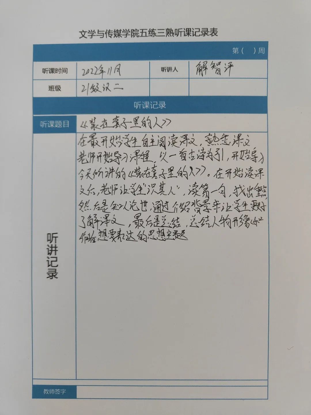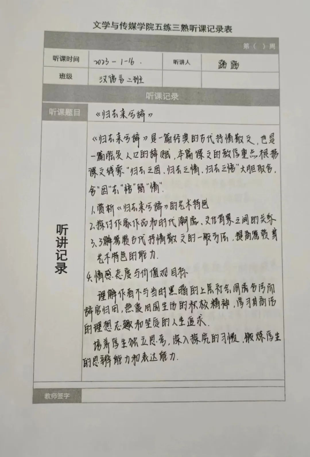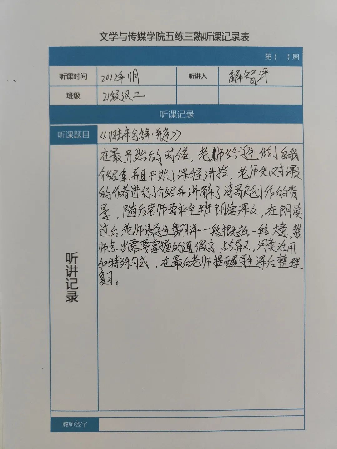 听课记录是听课的第一手资料,是课后进行教学反思交流的材料和依据,更是促进教师专业成长和提高教学水平的极其宝贵财富,为使汉语言专业学生更好的学习专业技能,PP电子游戏网站特开展听课笔记优秀作品展示活动,让我们一起来看看同学们的听课记录表吧!