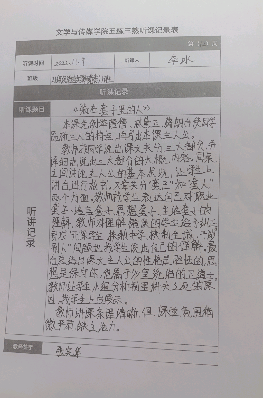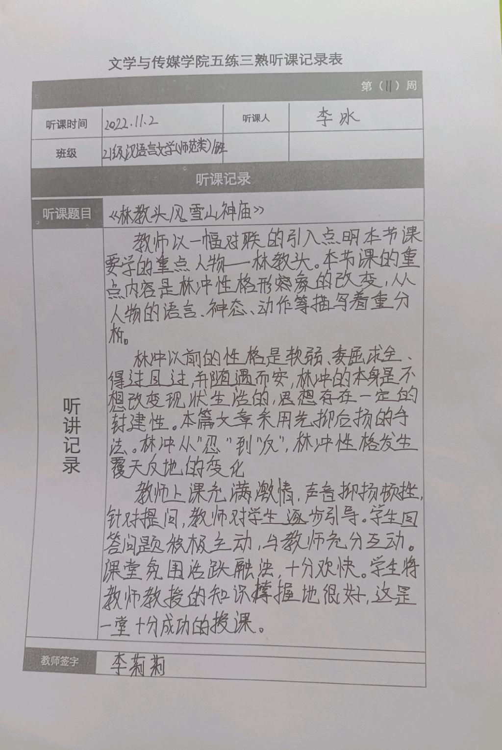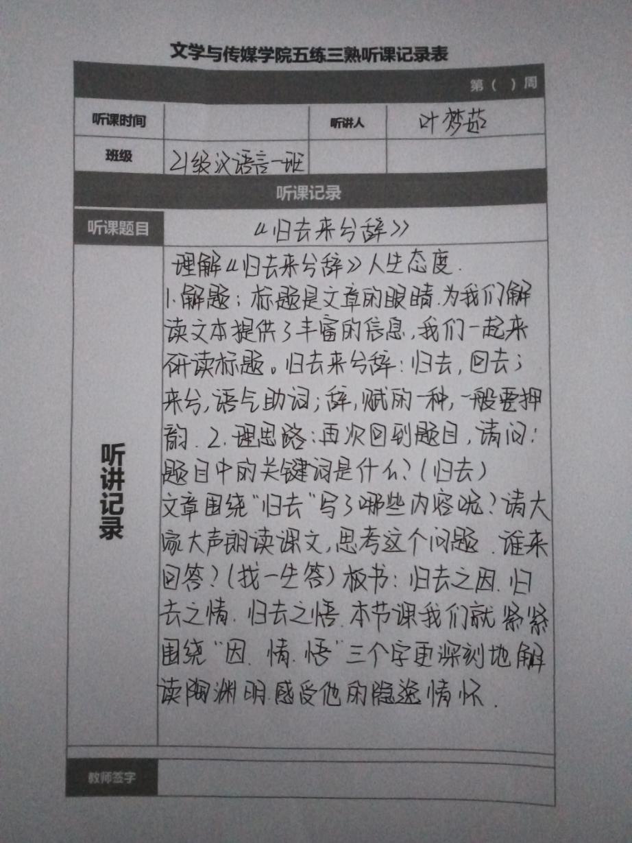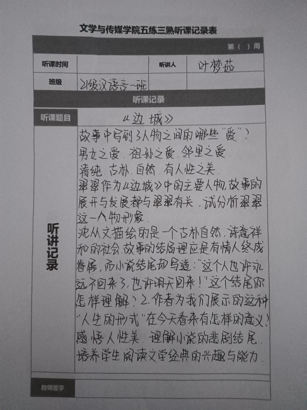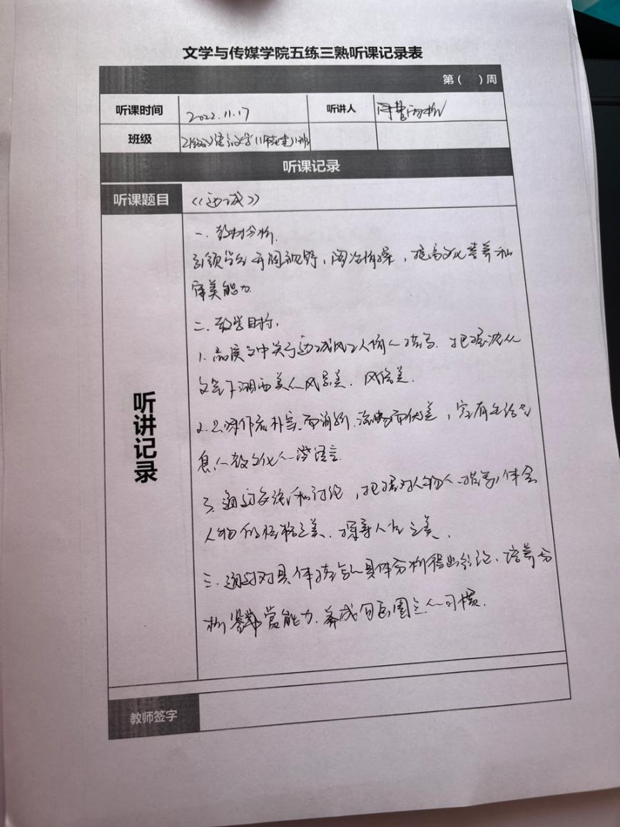 听课记录是听课的第一手资料,是课后进行教学反思交流的材料和依据,更是促进教师专业成长和提高教学水平的极其宝贵财富,为使汉语言专业学生更好的学习专业技能,PP电子游戏网站特开展听课笔记优秀作品展示活动,让我们一起来看看同学们的听课记录表吧!