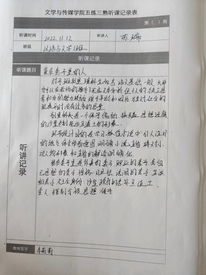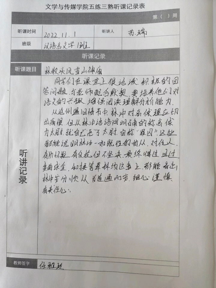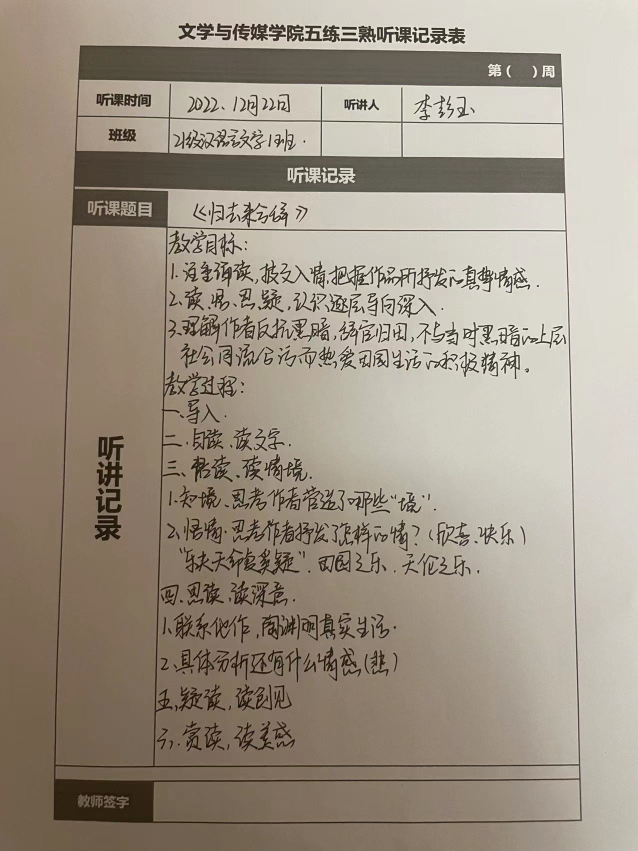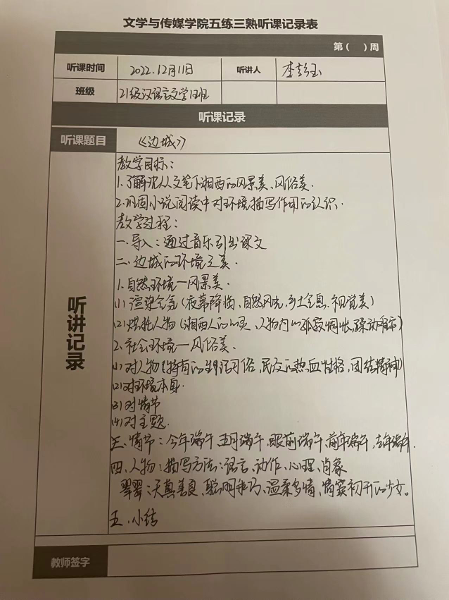 听课记录是听课的第一手资料,是课后进行教学反思交流的材料和依据,更是促进教师专业成长和提高教学水平的极其宝贵财富,为使汉语言专业学生更好的学习专业技能,PP电子游戏网站特开展听课笔记优秀作品展示活动,让我们一起来看看同学们的听课记录表吧!