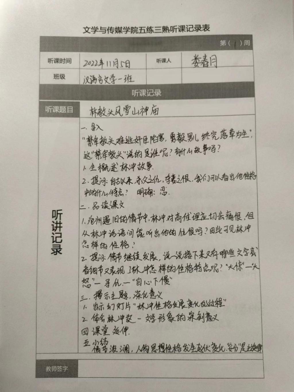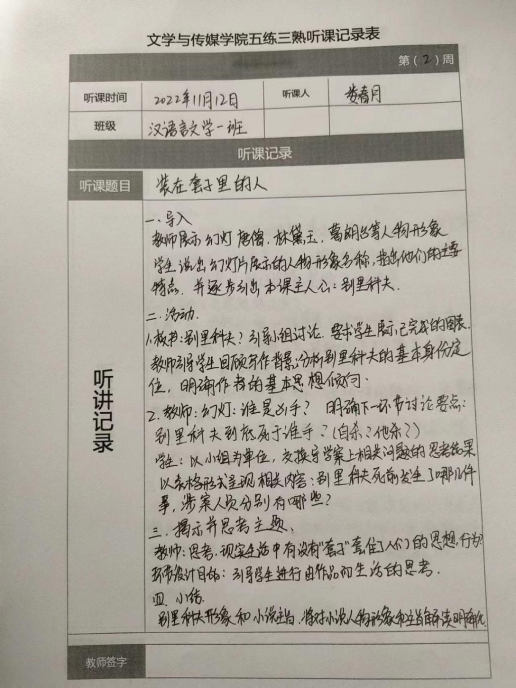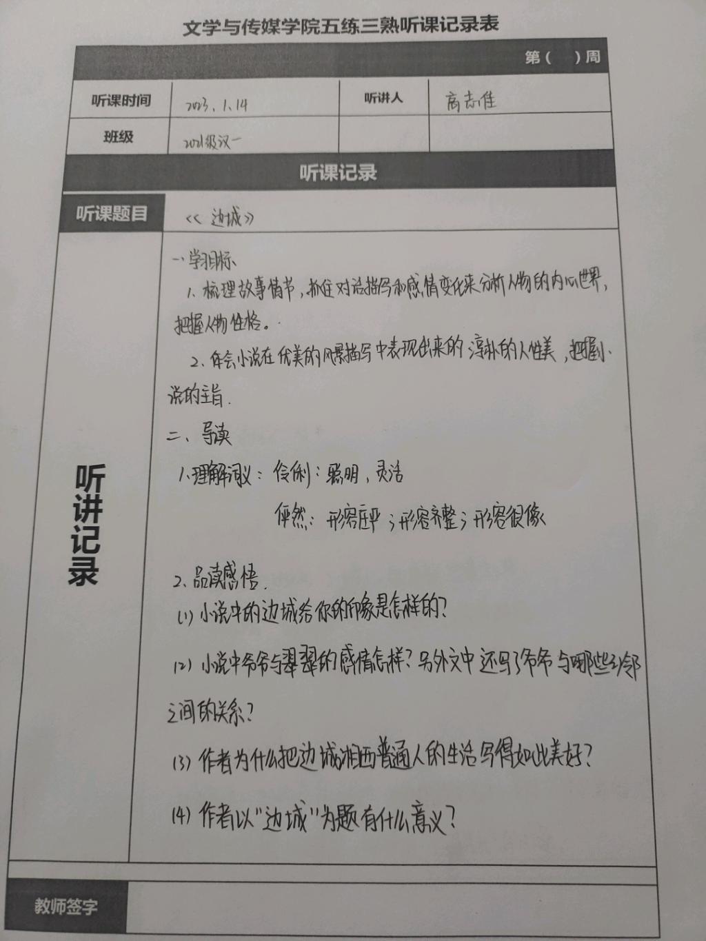 听课记录是听课的第一手资料,是课后进行教学反思交流的材料和依据,更是促进教师专业成长和提高教学水平的极其宝贵财富,为使汉语言专业学生更好的学习专业技能,PP电子游戏网站特开展听课笔记优秀作品展示活动,让我们一起来看看同学们的听课记录表吧!