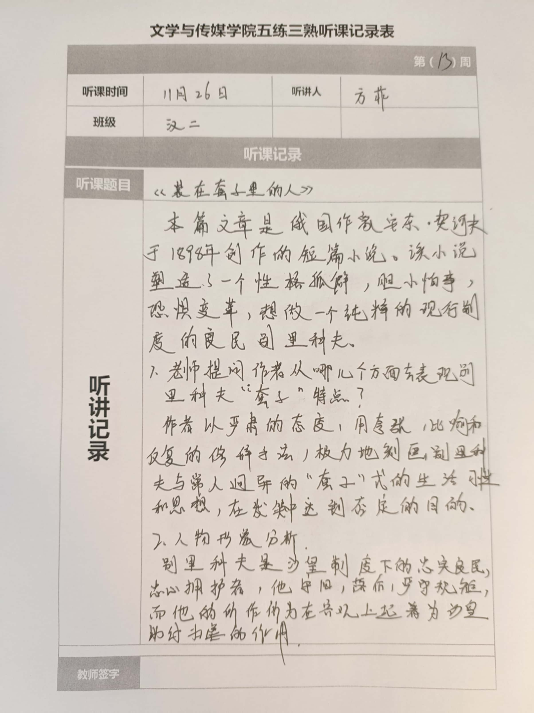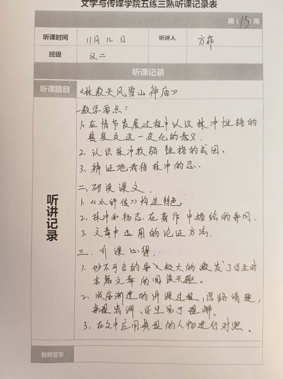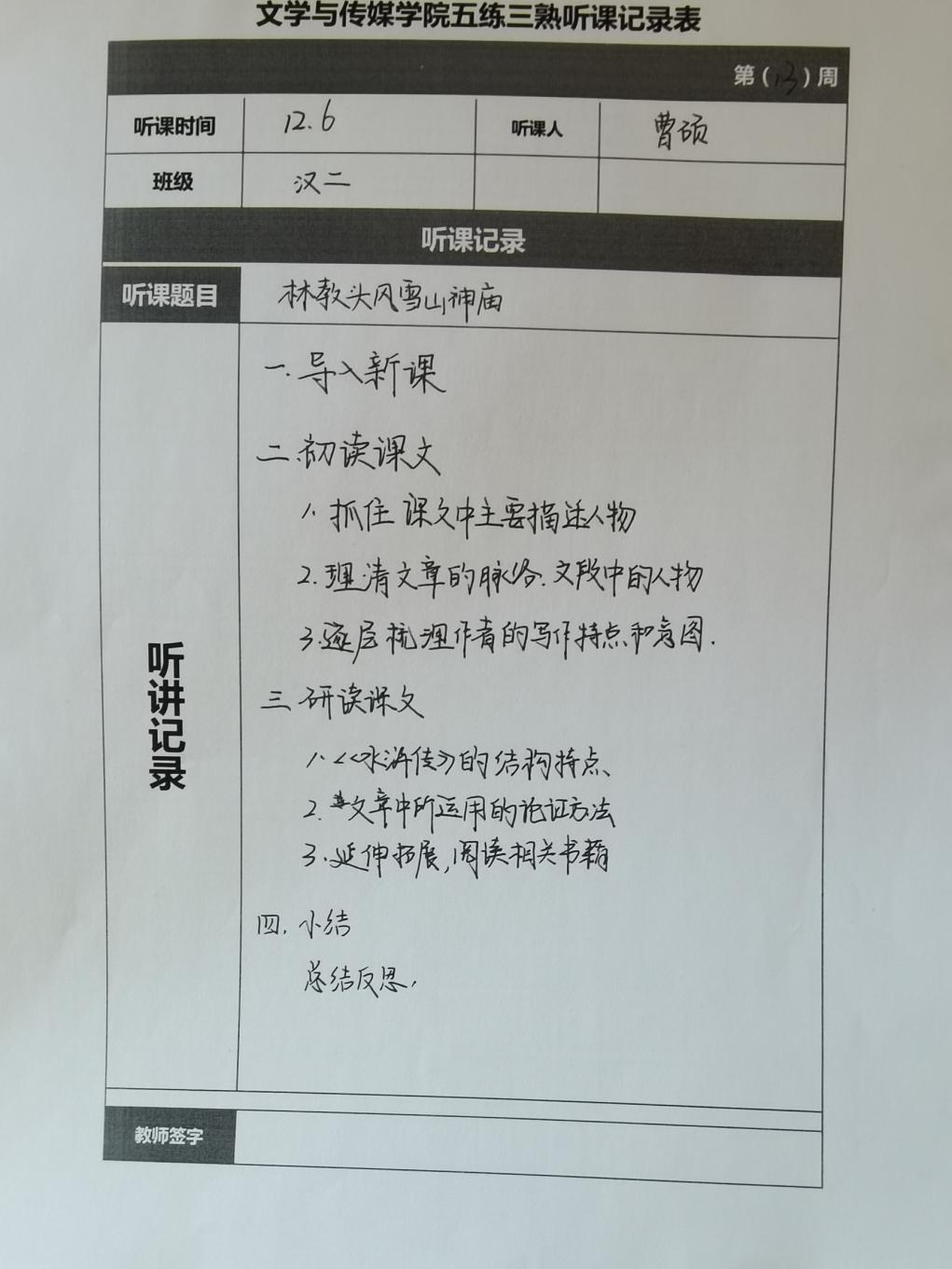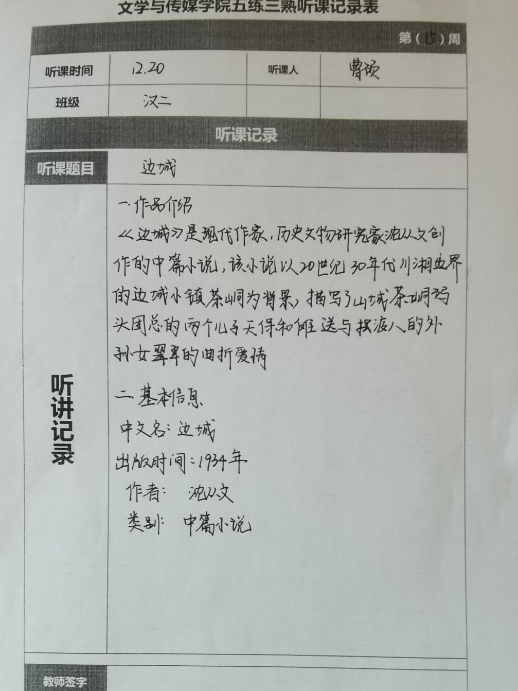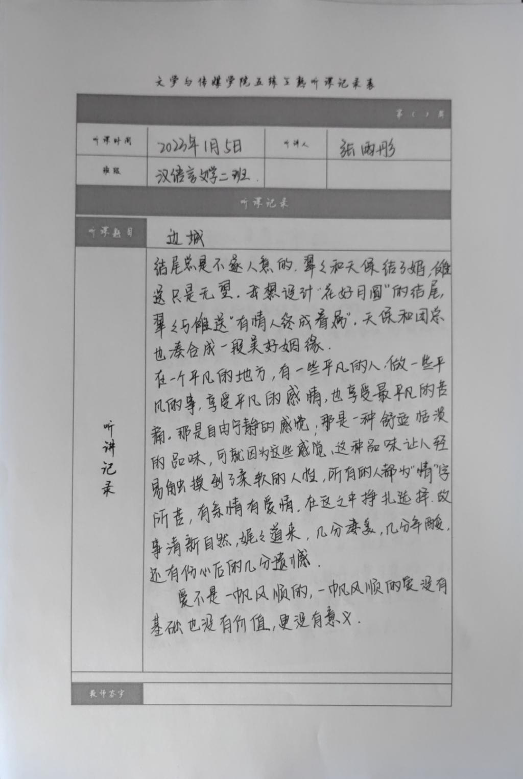 听课记录是听课的第一手资料,是课后进行教学反思交流的材料和依据,更是促进教师专业成长和提高教学水平的极其宝贵财富,为使汉语言专业学生更好的学习专业技能,PP电子游戏网站特开展听课笔记优秀作品展示活动,让我们一起来看看同学们的听课记录表吧!