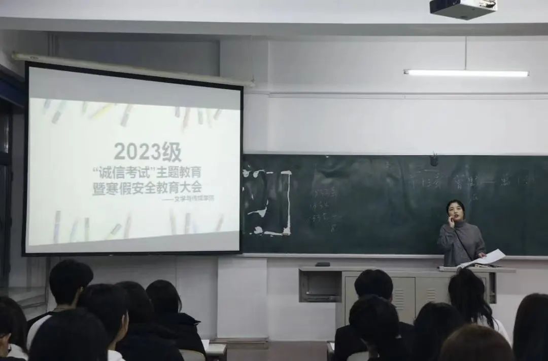 为切实加强学风建设,严肃考风考纪,端正学生考试态度,杜绝考试作弊现象发生,12月13日下午,PP电子于汇文楼604教室召开了诚信考试主题教育暨寒假安全教育大会,本次会议由2023级辅导员殷跃主持,2023级全体学生参加。
