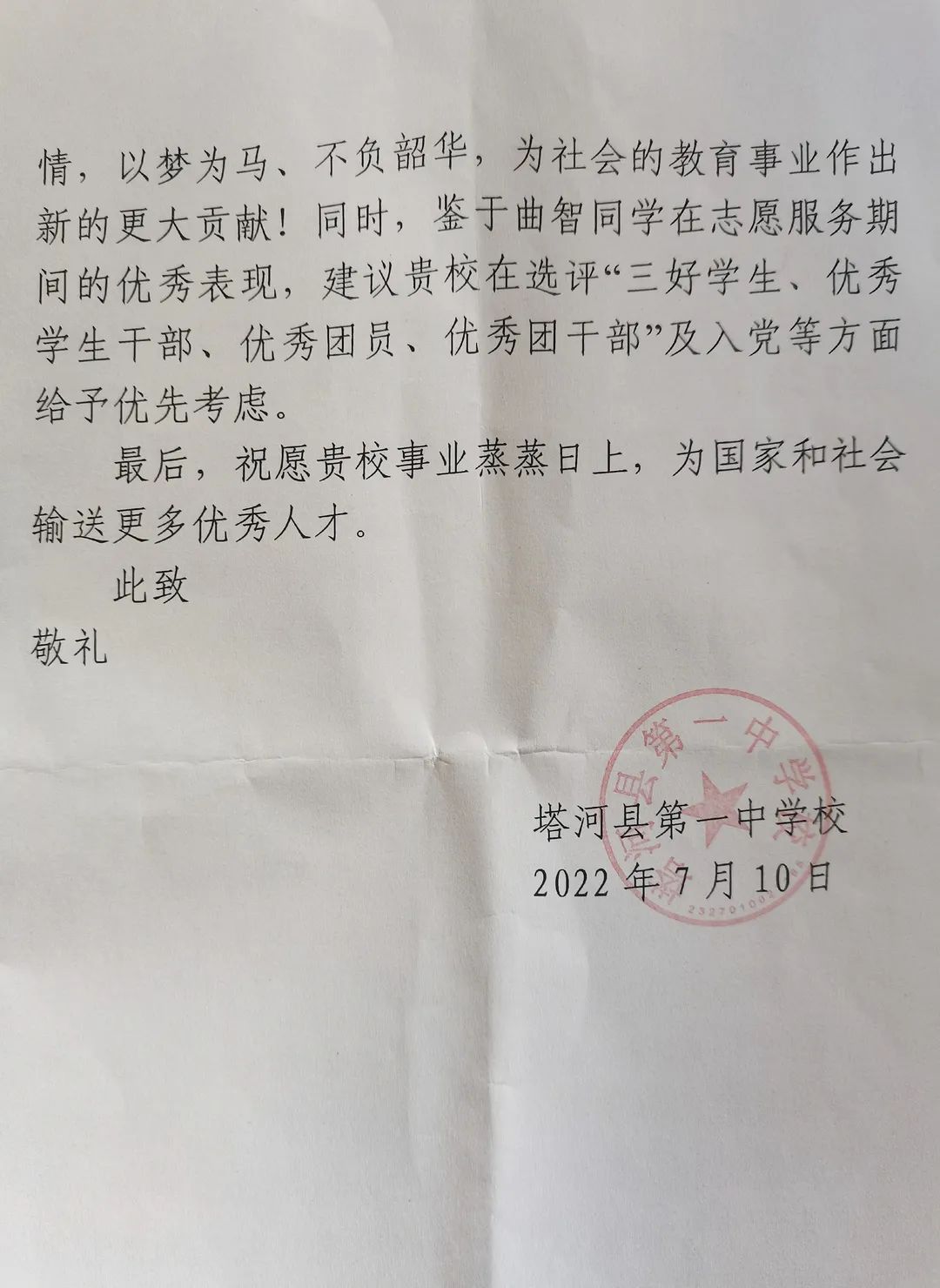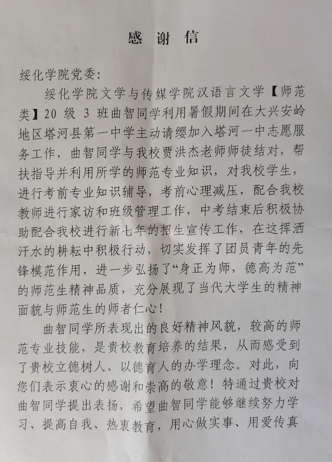 7月10日,PP电子收到一封来自塔河县第一中学的感谢信。信中对PP电子PP电子游戏网站2020级汉语言文学专业三班学生曲智同学主动请缨为塔河一中学生提供考前辅导、缓解心理压力等志愿服务活动予以了高度的肯定和赞扬,对PP电子在培养学生精神风貌、道德素养、师范精神等方面所做的教育工作表示由衷的感谢。