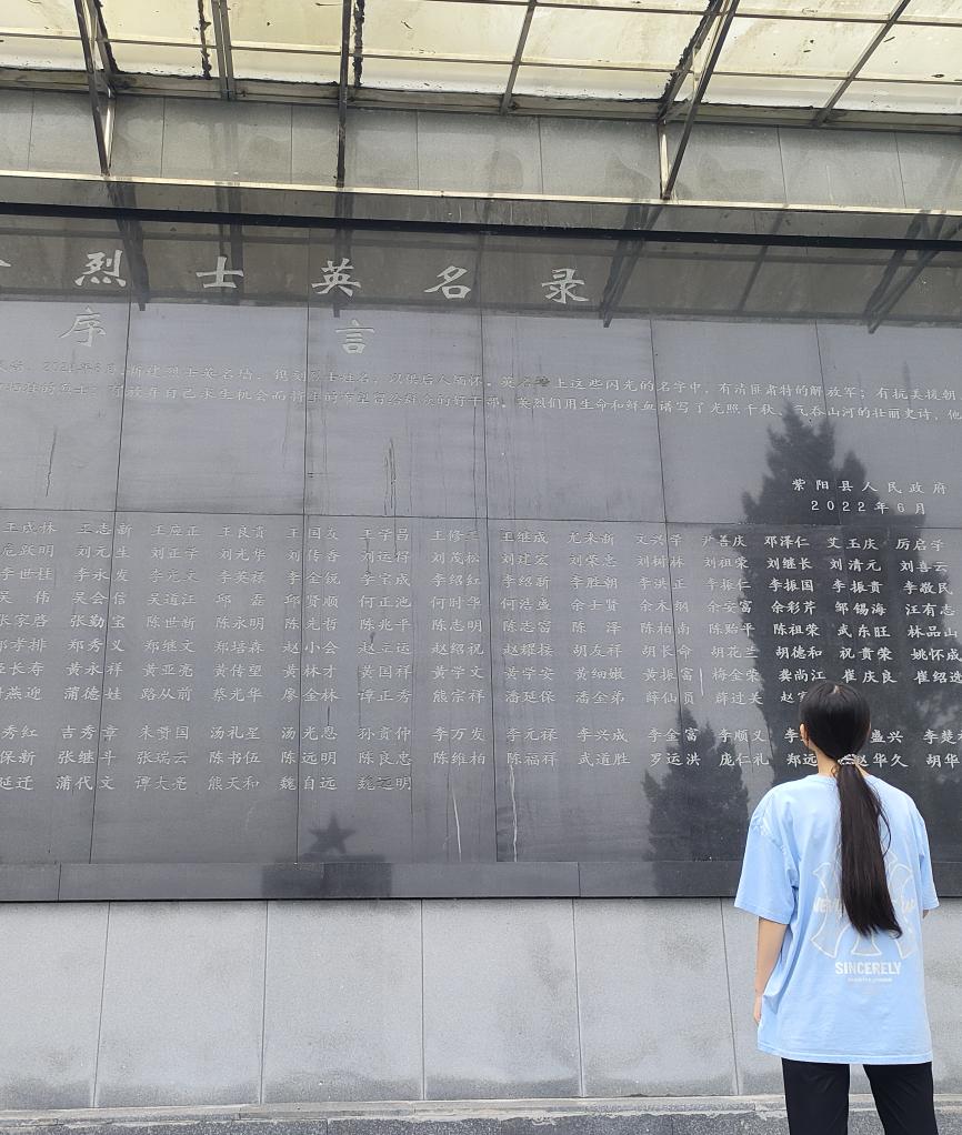 到达烈士陵园后,映入她眼帘的是一座座庄严肃穆的烈士纪念碑。它们静静地矗立在那里,仿佛在诉说着过去的峥嵘岁月。随后她又来到了烈士英名录前,名录上密密麻麻的写着一位位烈士的名字,陈文敏同学驻足在名录前怀着沉重的心情默默地向战士们表达敬意,这些名字时刻提醒着我们和平年代的来之不易。最后她又去往了爱国主义教育红色基地,了解紫阳县人民抗日救国的英雄事迹。