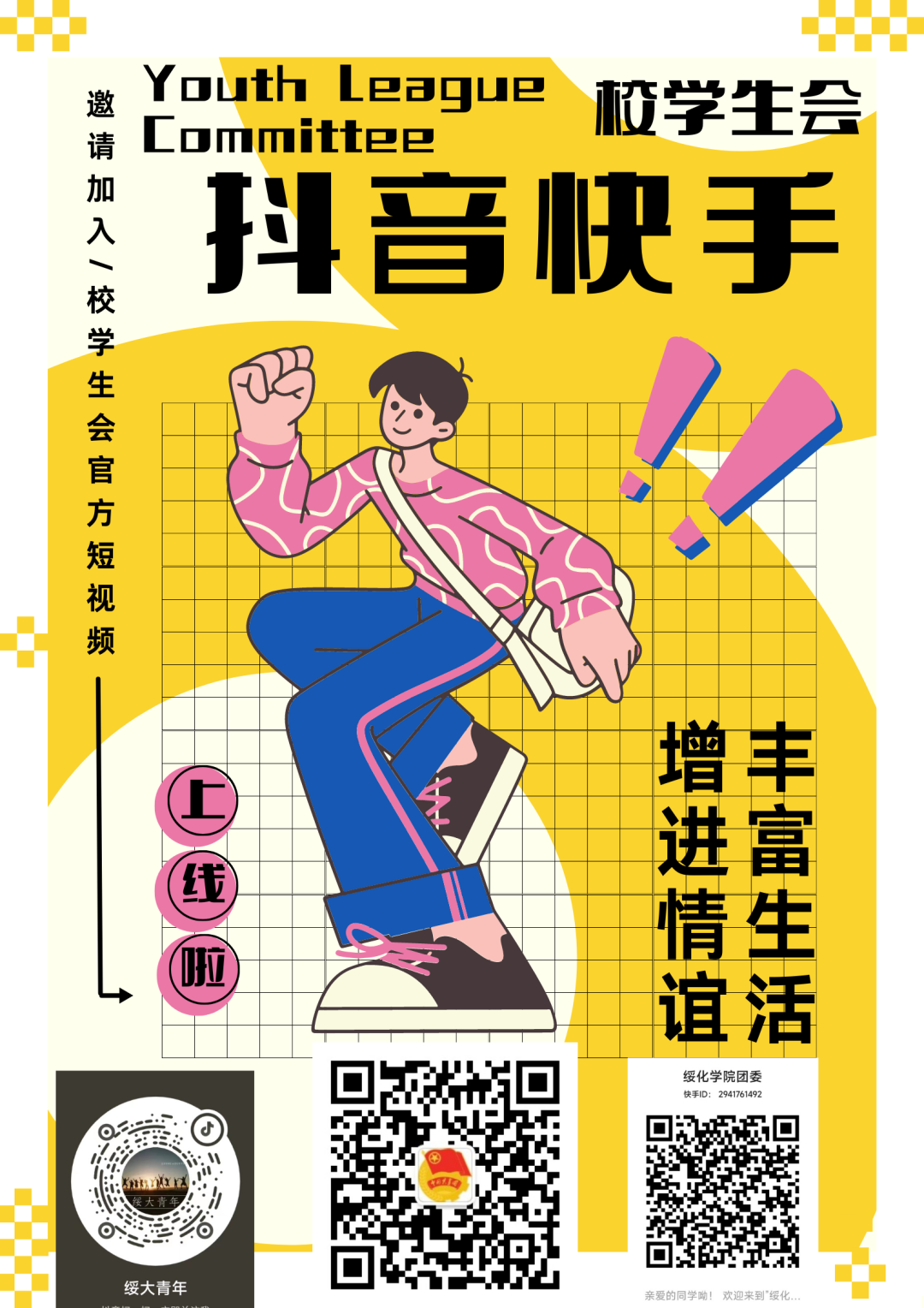 我们的抖音、快手账号名称分别为:绥大青年、PP电子游戏网站团委,欢迎各位同学进行关注与评论。